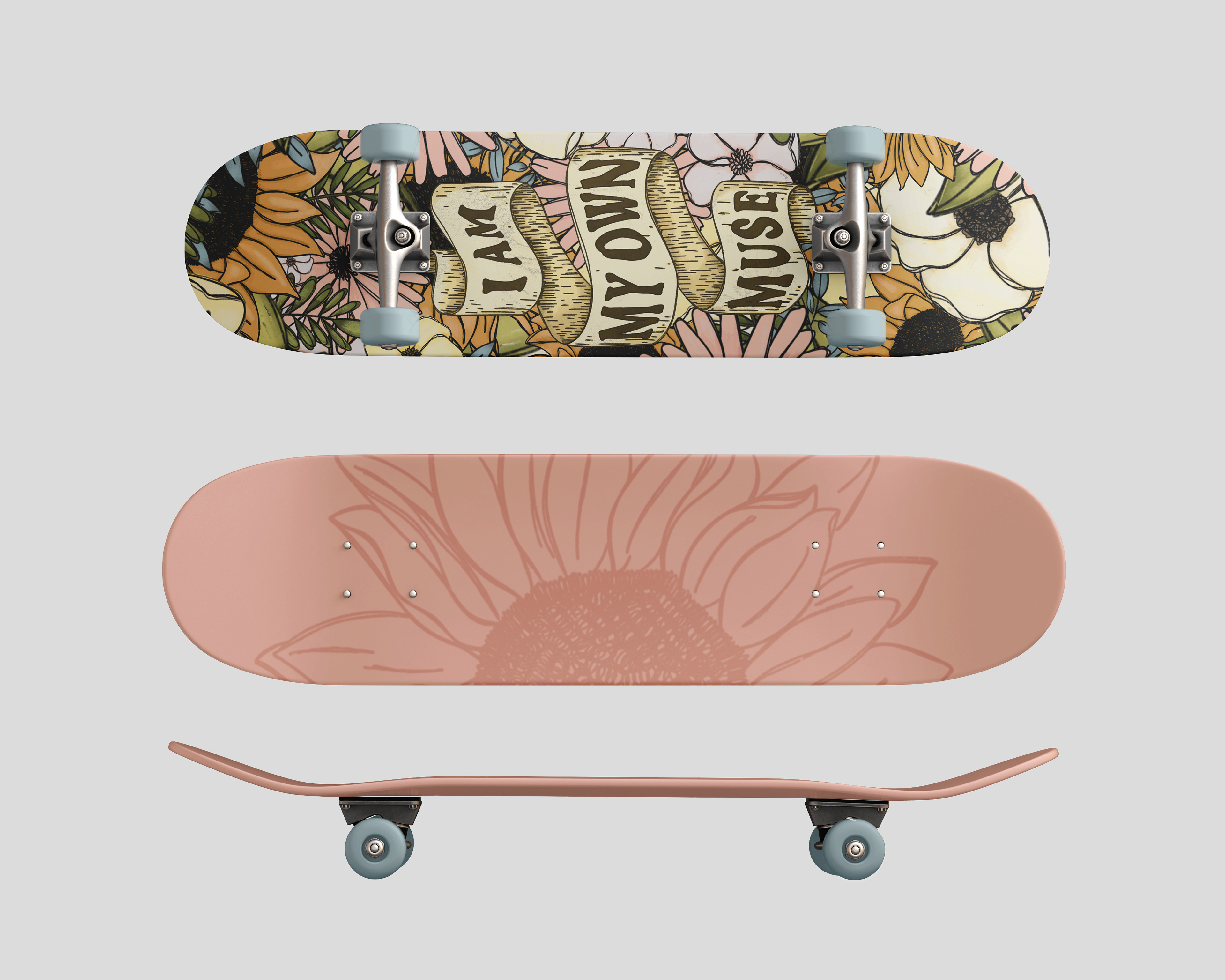 This skateboard deck was designed around a central idea of ‘badass’. The illustrated florals and quote that cover the deck are representative of one of my favorite badass artists, Frida Kahlo.